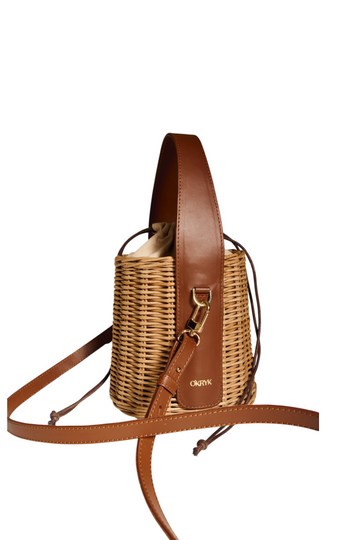 Details:- handmade wicker basket- two-layer leather handle- inside cotton bag- adjustable drawstring closure- long adjustable...