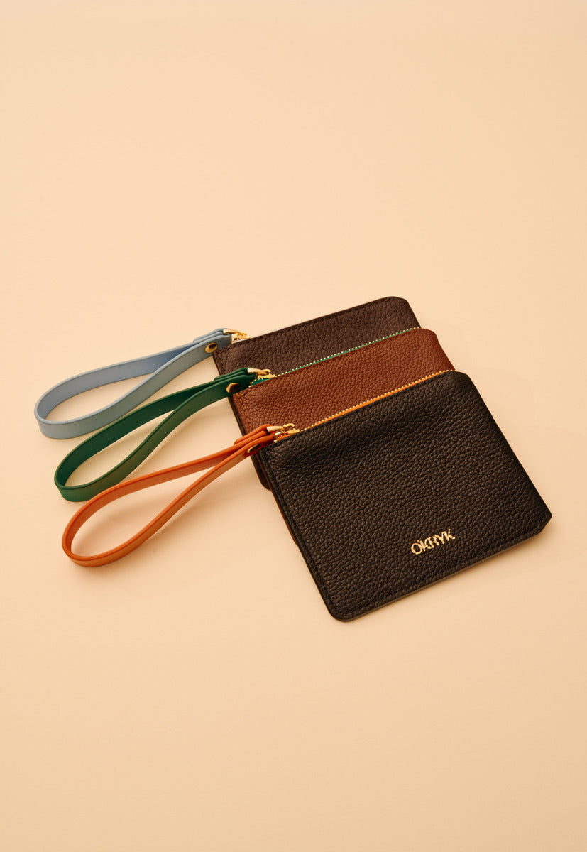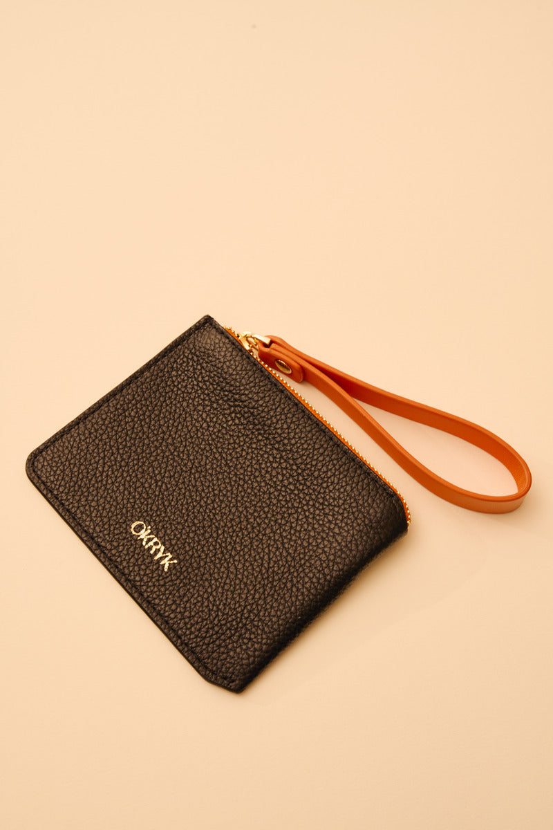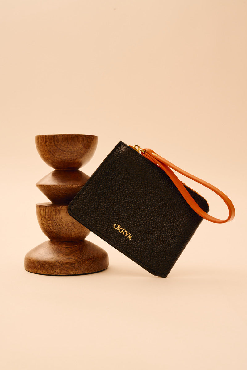 Black Leather Wallet with an Orange Strap