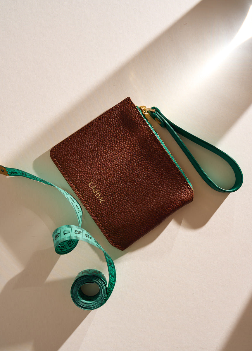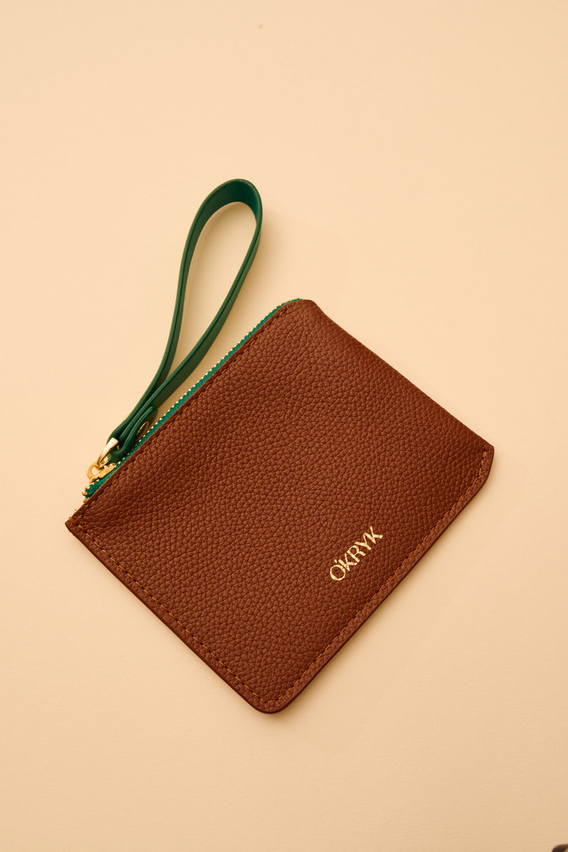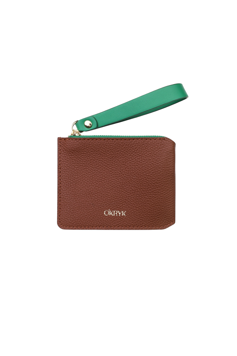 Caramel Leather Wallet with a Green Strap